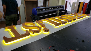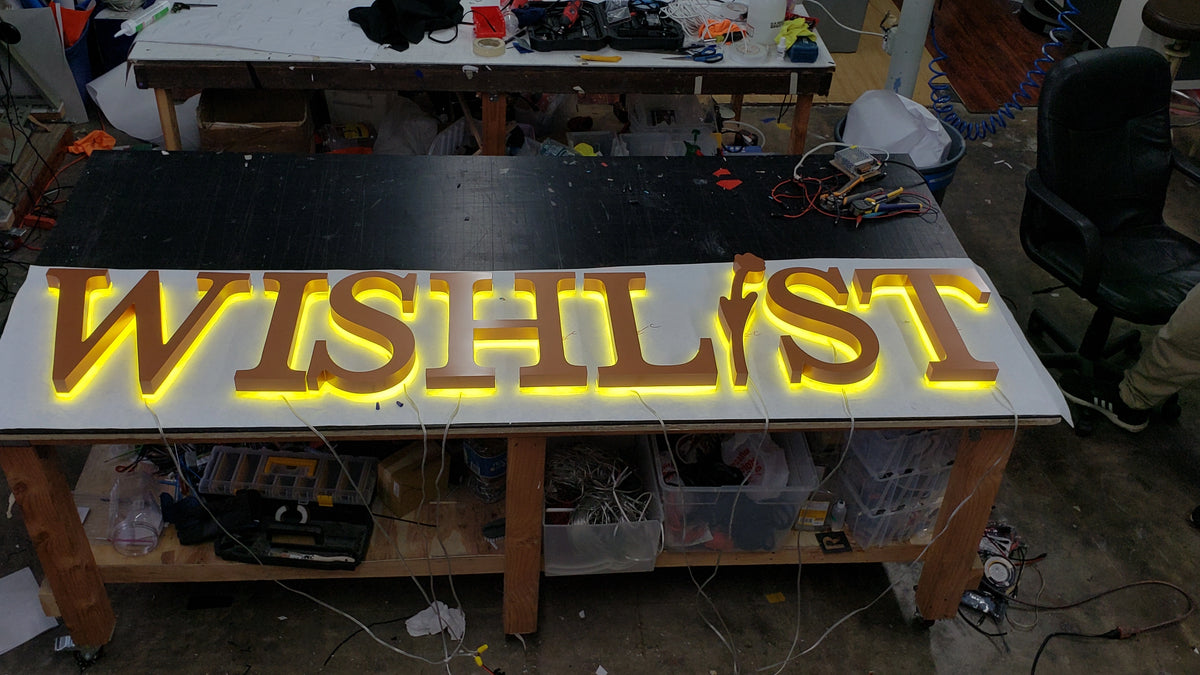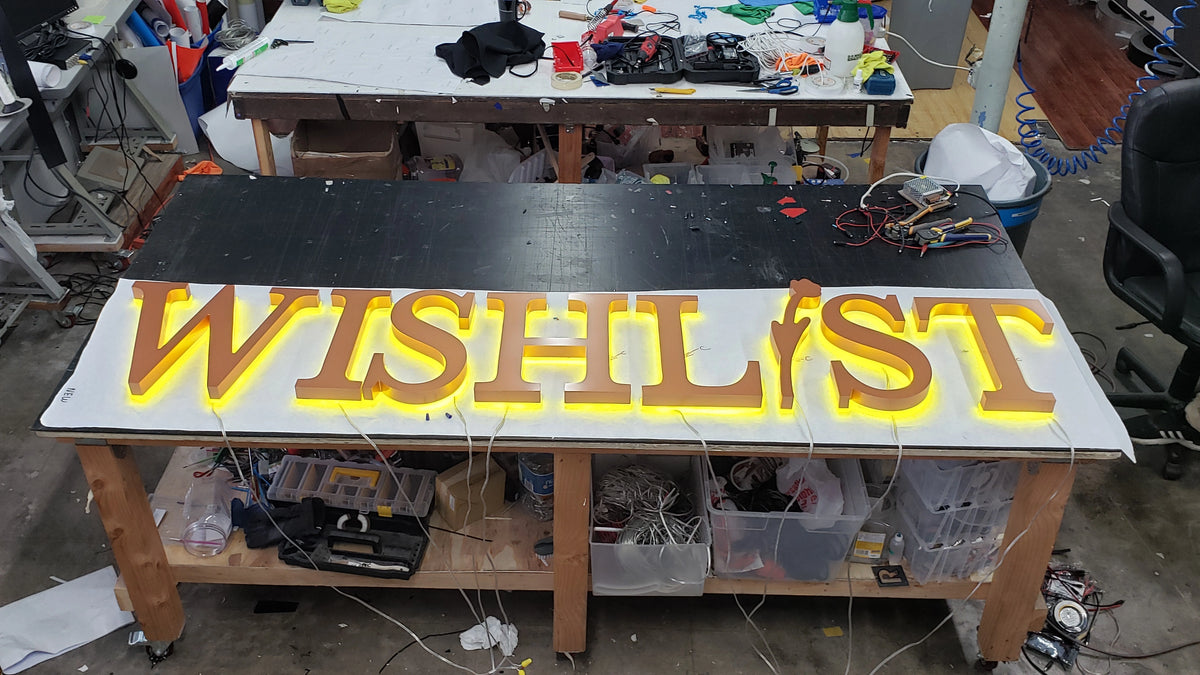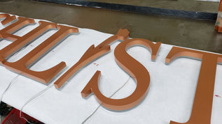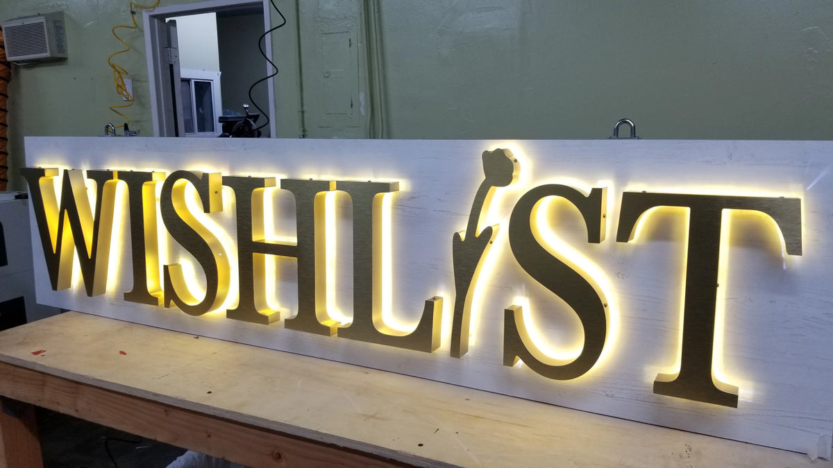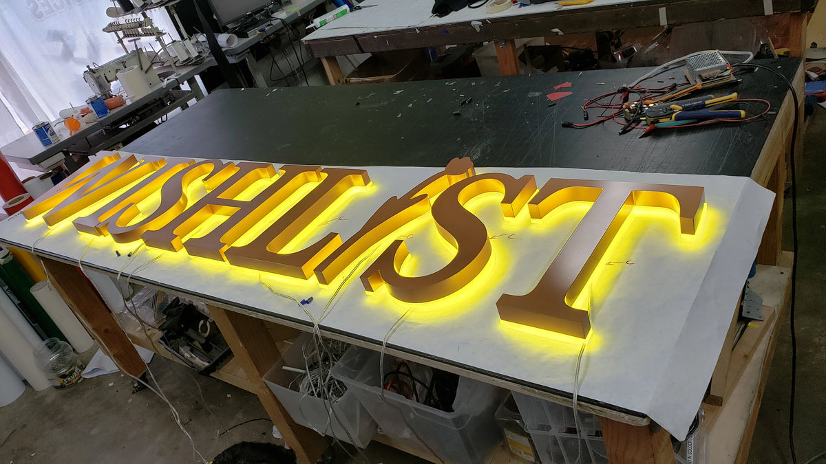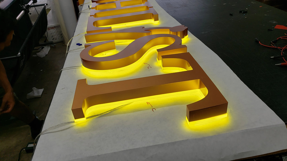 Made from carbon steel, welded, and finished with high quality paints (Createx Wicked Colors, Dunn Edwards, Sherwin Williams, & more), our reverse channel letters create the ideal sign. Integrating flexible "S-Shape" LED modules creates a neon-like effect. With a polycarbonate mounting base, our reverse channel letters are installed first on the wall, then the letters are secured from the sides.
